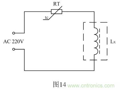 開關變壓器退磁的最好的方法是讓開關變壓器初級線圈在非常短的時間內通過一個幅度為3~5倍Imax(極限電流)的阻尼振蕩電流。因此,可用一個20~40歐姆的消磁熱敏電阻(可用兩個消磁熱敏電阻串聯)與開關變壓器的初級線圈串聯,然後接到110~220V/50Hz交流電源上,大約隻需要20多秒鍾,待消磁熱敏電阻完全加熱後,即可達到退磁的目的,如圖14所示。在圖14中,RT為熱敏電阻,Lx為開關變壓器的初級線圈。