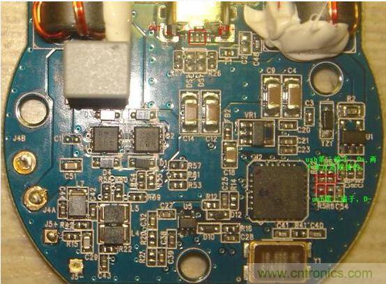 接著,把點金石電路板上的線引出來,並把中間三腳短接。這裏忘了拍照,引用segara大神的圖。或者也可以按照segara的方法短接R62、R63和第三腳D+