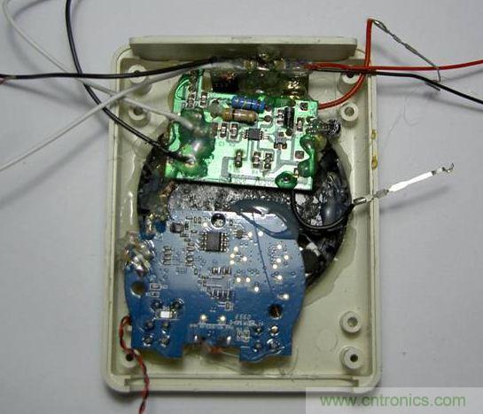 在這裏我還在上蓋上鑽了兩個小孔製作了指示燈。我找了一直圓珠筆,筆杆是那種硬硬的透明的PE材料,我用電磨磨出剛好穿過小孔的細條,用打火機小心彎曲,把細條的另一端貼住電路板上的LED,將指示燈的燈光引到上蓋外麵。然後用油料(橡皮泥)或者電工膠布包住led和(he)細(xi)條(tiao),防(fang)止(zhi)燈(deng)光(guang)幹(gan)擾(rao)。最(zui)後(hou)用(yong)指(zhi)甲(jia)銼(cuo)將(jiang)上(shang)蓋(gai)外(wai)突(tu)出(chu)來(lai)的(de)筆(bi)杆(gan)銼(cuo)平(ping),用(yong)木(mu)片(pian)拋(pao)光(guang),一(yi)切(qie)都(dou)很(hen)完(wan)美(mei)。可(ke)惜(xi)製(zhi)作(zuo)的(de)過(guo)程(cheng)忘(wang)記(ji)照(zhao)相(xiang)了(le),還(hai)好(hao)下(xia)文(wen)可(ke)以(yi)看(kan)到(dao)做(zuo)好(hao)的(de)效(xiao)果(guo)。
