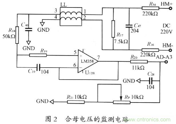合母電壓監測電路如圖2所示。合母電壓流過電阻R16、R17、R54,在電阻R17上取樣,故而電阻R17應選用高精度電阻。R16和R54因為要比電阻R17大得多,又是出現在分母上,故而不必選用高精度電阻。LL的作用是抑製共模幹擾。可以通過調節電位器Rp的大小來使所要監測電壓的大小符合A/D轉換器輸入電壓要求。
