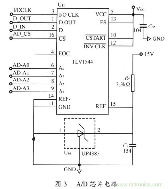 A/D轉換芯片采用TLV1544。TLVl544的主要特點是:寬範圍的單電源供電,VCC可為2.7~5.5V;芯片內部有著較高的轉換速率,轉換時間小於10μs;芯片提供4路外部輸入通道,通過編程給芯片不同的狀態字設置可以任意選擇4個輸入通道之一;芯片有4個端口作為同步串行接口,通過SPI總線的形式與微處理器連接;11位A/D轉換,足以滿足係統的要求。如圖3所示。