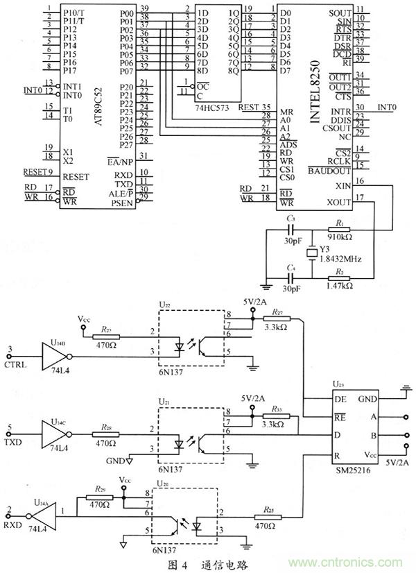 整個係統內部通過RS485進行通信。具體電路如圖4所示。因為控製芯片都采用AT89C52,作為主監控單元CPU隻有一個串口,而其並口也沒有充分利用起來,故通過可編程串行接口芯片8250擴展串口,用並口來模擬串口。