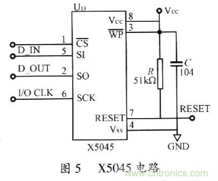 X5045電路的設計如圖5所示。本器件將四種功能合於一體:上電複位控製、看門狗定時器、降壓管理以及具有塊保護功能的串行EEPROM。它有助於簡化應用係統的設計,減少印製板的占用麵積,提高可靠性。將其與CPC以SPI總線方式連接,讀寫簡單,其內部的EEPROM還可以保護一些重要數據。