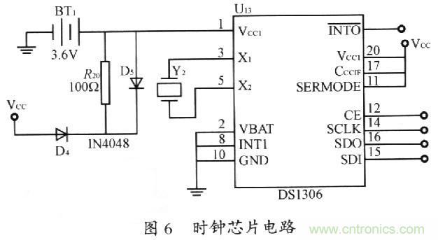 采用功能齊全的時鍾芯片DS1306。DS1306的時間、日曆和報警器可以通過寫相應的寄存器位來設置和初始化。通過讀相應寄存器就可獲得日曆和時間。DSl306的電源供給有三種運行方式,本係統采用可充電電池的方式,如圖6所示。