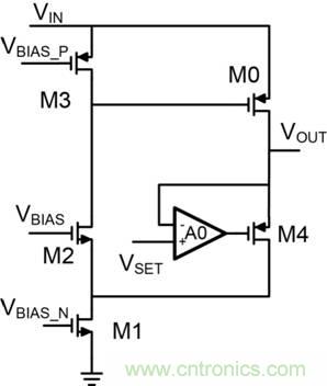 圖3:M4位於放大器反饋環路中、無輸出電容器的LDO。
