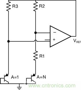 電阻器R2和R3分別可確定通過Q1和Q2 的電流值。R2和R3的變化可導致參考電壓(公式5)的正溫度係數不準確。不過,可通過對電阻器R2與R3進行良好匹配來降低該變化所引起的誤差。