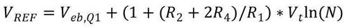 tongguotianjiashuangjixingjingtiguandefuwenduxishujishejijiandianya,kehuodedaixidianyadediwenxishu,congerketongguozaibutongdianliumiduxiapianzhidelianggejishejijiandianyazhichahuodezhengwenduxishudianya。weidianzuqiR2和R3選擇相等的值,參考電壓就可表示為公式5: