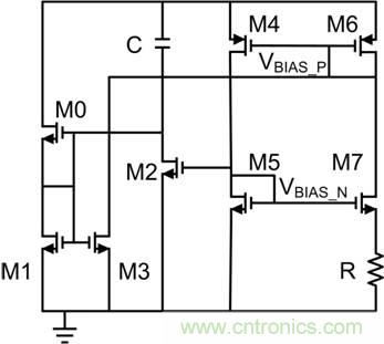 偏置發生器通常不需要特別啟動電路,這可減少靜態電流和占用麵積。如果電流足夠小,電阻R 就可以忽略。由M5/M7和M4/M6構成的兩個電流鏡可互連成一個閉環。