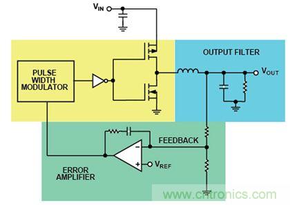 將典型開關電源輸出電壓(圖1)與內部基準電壓進行比較,可看到差別集中在脈寬調製器(PWM)。PWM將斜坡與放大器輸出進行比較,生成PWM信號來控製開關,從而向負載供電。
