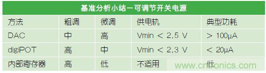 控製誤差放大器引腳電壓,便可調整輸出電壓。這可以通過使用DAC,或者使用數字電位計,以外部方式實現,如圖2所示。某些電壓調節器允許使用串行接口(比如PMBus、I2C或SPI)在內部控製反饋電壓。表1比較了三種方法的調整能力和功耗。