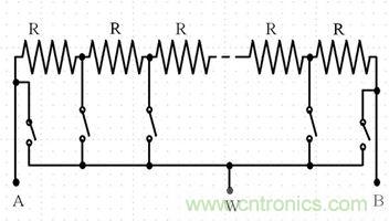 圖3:顯示電子開關的64位數字電位計。同一時間隻能閉合一個電子開關,該開關決定電阻比。