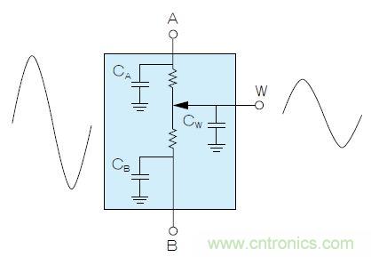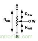 以數字電位計代替R1和R2時,需考慮一些問題。數字電位計內部有兩個電阻串(RAW和RWB),如圖4所示。