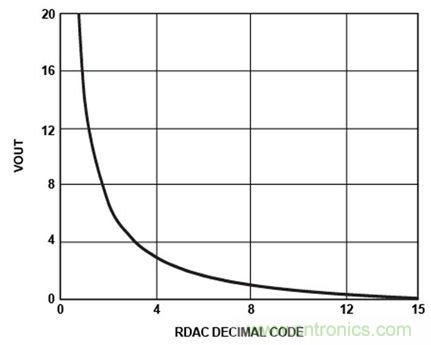 以RAW和RWB代替R1和R2可實現對數傳遞函數。數字碼和輸出電壓之間的非線性關係降低了低端分辨率。圖5顯示了這個取自數字電位計的對數傳遞函數。