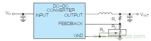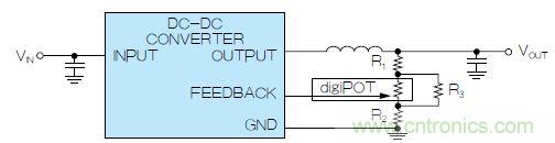 圖2. 使用數字電位計調整DC-DC轉換器輸出電壓,組成可變反饋電阻