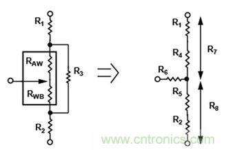 使用串並聯組合對電位計進行線性化可能十分複雜,如圖10中的等效電路所示。