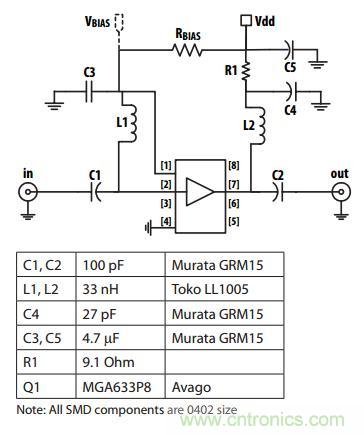 偏壓調整器可以通過改變外部的電壓(Vbias)來調整低噪放的靜態電流(Ids)。其驅動電流(Ibais<1mA)和大多數的CMOS器件相當。可以直接連接到係統的控製器引腳,然後控製低噪放的開關狀態使其應用在時分模式。