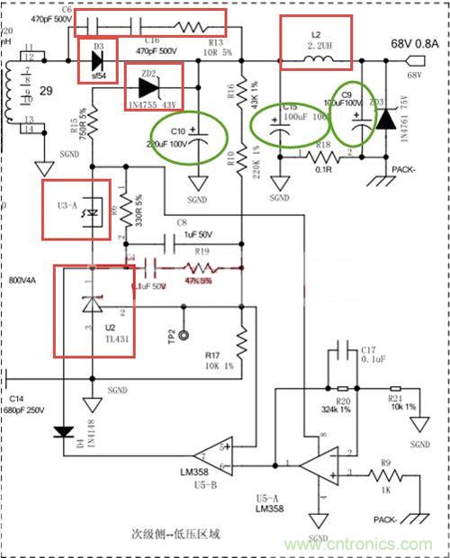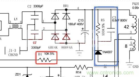 紅線圈起的電阻為I C的高壓啟動電阻,電阻阻值的選擇由IC特性決定。