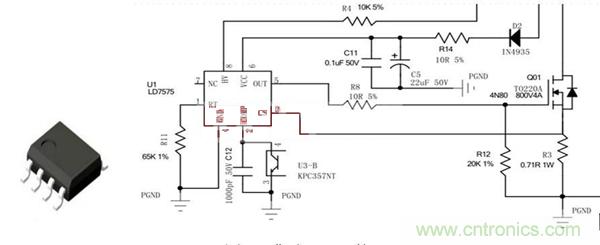 PWM集成IC的作用:500V高壓啟動電路;電流控製模式;VCC具有過壓保護功能;具備過載保護功能;500mA驅動能力;可調開關頻率;內置諧波補償電路。
