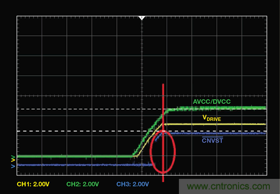 在所有電源均完全建立之前,不得切換數字引腳。對於SAR ADC,轉換開始引腳CNVST 可能對噪聲敏感。在圖1 所示示例中,當AVCC、DVCC 和VDRIVE 仍在上升時,主機cPLD 拉高CNVST。這可能使 AD7367 進入未知狀態,因此,在電源完全建立之前,主機應使 CNVST 保持低電平。