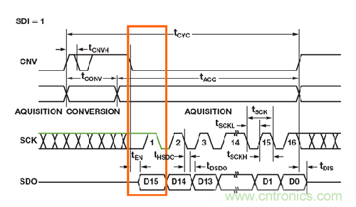 ADI 公司帶SPI 接口的許多SAR ADC 都是從 CS 或CNV 的下降沿為MSB 提供時鍾信號,剩餘的數據位則跟隨SCLK 的下降沿,如圖3 所示。在讀取MSB 數據時,要使用等式中的tEN 而非tDRV。