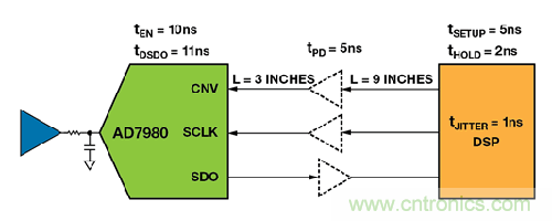 在圖4 中,DSP 主機訪問 AD7980 處於3 線 CS 模式下,其中,VIO = 3.3 V。DSP 鎖存SCLK 下降沿上的SDO 信號。DSP 的額定最小建立時間為5 ns,最小保持時間為2 ns。對於典型的FR-4PCB 板,傳播延遲約為180 ps/in。緩衝器的傳播延遲為5 ns。CNV、SCLK 和SDO 的總傳播延遲為