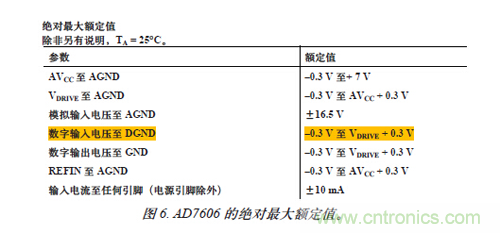 過衝和欠衝可能損壞輸入保護電路,或者縮短IC 的使用壽命。圖6 所示為 AD7606 的絕對最大額定值。數字輸入電壓應在–0.3 V 和VDRIVE + 0.3 V 之間。另外,如果振鈴高於最大VIL 或小於最小VIH 可能導致邏輯誤差。