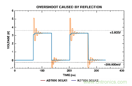 在圖8 中,SCLK1 上的大過衝違反了–0.3 V 至+3.6 V 的絕對最大額定值。串聯電阻可減小SCLK2 上的壓擺率,使信號處於額定值之內。