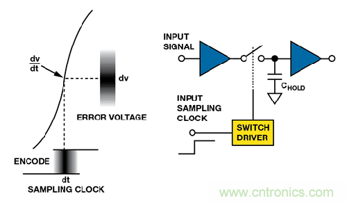 孔徑或采樣時鍾抖動設定SNR 限值,尤其是對高頻輸入信號。係統抖動有兩個來源:來自片內采樣保持電路的孔徑抖動(內部抖動),以及采樣時鍾上的抖動(外部抖動)。孔徑抖動為轉換間的 采樣時間變化,為ADC 的函數。采樣時鍾抖動通常為主要誤差源,但兩個源都會導致模擬輸入采樣時間變化,如圖9所示。它們的影響難以區分。