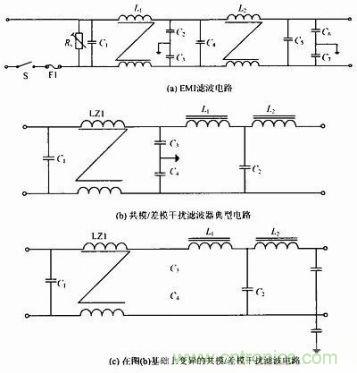 開關電源對內、外的幹擾及抗幹擾中,共模信號與開關器件的工作方式、散熱器的安裝及整機PCB板與機殼的連接有相當複雜的關係,共模信號在一定的條件下又可轉變成差模信號。其中解決共模幹擾除了上述一般的EMI濾波電路,還可按如下電路圖的思想在電路上改進,使開關電源能夠在電路上改進從而提高性能。圖1(b)為共模/差模幹擾濾波器典型電路,圖1(c)為在圖1(b)基礎上變異的共模/差模幹擾濾波電路。