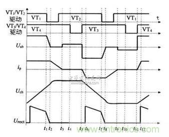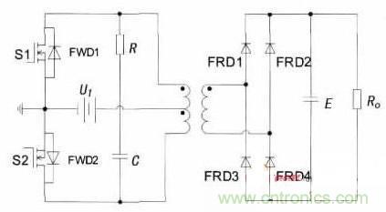 圖1給出了推挽逆變-高頻變壓-全橋整流DC-DC變換器的基本電路拓撲。通過控製兩個開關管S1和S2以相同的開關頻率交替導通,且每個開關管的占空比d均小於50%,留出一定死區時間以避免S1和S2同(tong)時(shi)導(dao)通(tong)。由(you)前(qian)級(ji)推(tui)挽(wan)逆(ni)變(bian)將(jiang)輸(shu)入(ru)直(zhi)流(liu)低(di)電(dian)壓(ya)逆(ni)變(bian)為(wei)交(jiao)流(liu)高(gao)頻(pin)低(di)電(dian)壓(ya),送(song)至(zhi)高(gao)頻(pin)變(bian)壓(ya)器(qi)原(yuan)邊(bian),並(bing)通(tong)過(guo)變(bian)壓(ya)器(qi)耦(ou)合(he),在(zai)副(fu)邊(bian)得(de)到(dao)交(jiao)流(liu)高(gao)頻(pin)高(gao)電(dian)壓(ya),再(zai)經(jing)過(guo)由(you)反(fan)向(xiang)快(kuai)速(su)恢(hui)複(fu)二(er)極(ji)管(guan)FRD構成的全橋整流、濾波後得到所期望的直流高電壓。由於開關管可承受的反壓最小為兩倍的輸入電壓,即2UI,而電流則是額定電流,所以,推挽電路一般用在輸入電壓較低的中小功率場合。