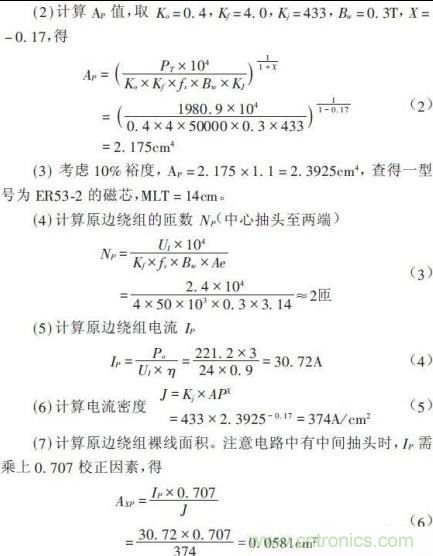 采用麵積乘積(AP)法進行設計。對於推挽逆變工作開關電源,原邊供電電壓UI=24V,副邊為全橋整流電路,期望輸出電壓UO=220V,輸出電流IO=3A,開關頻率fs=25kHz,初定變壓器效率η=0.9,工作磁通密度Bw=0.3T.