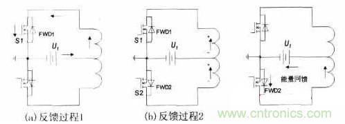 圖2(a)為S1導通、S2關斷時的等效電路,圖中箭頭為電流流向,從電源UI正極流出,經過S1流入電源UI負極,即地,此時FWD1不導通;當S1關斷時,S2未導通之前,由於原邊能量的儲存和漏電感的原因,S1的端電壓將升高,並通過變壓器耦合使得S2的端電壓下降,此時與S2並聯的能量恢複二極管FWD2還未導通,電路中並沒有電流流過,直到在變壓器原邊繞組上產生上正下負的感生電壓。如圖2(b);FWD2導通,把反激能量反饋到電源中去,如圖2(c),箭頭指向為能量回饋的方向。圖3所示為AP法設計開關變壓器電路理想工作波形。