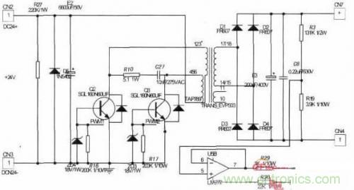 圖5為簡化後的主電路。輸入24V直流電壓,經過大電容濾波後,接到推挽變壓器原邊的中間抽頭。變壓器原邊另外兩個抽頭分別接兩個全控型開關器件IGBT,並在此之間加入RC吸收電路,構成推挽逆變電路。推挽變壓器輸出端經全橋整流,大電容濾波得到220V直流電壓。並通過分壓支路得到反饋電壓信號UOUT.