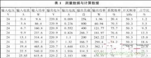 實驗結果表麵,輸出電壓穩定在220V,紋波電壓較小。最大輸出功率能達到近600W,係統效率基本穩定在80%,達到預期效果。如下表1所示。