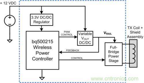 10W發射器係統運行在固定頻率下,但是卻使用一個可調前置穩壓器來改變用於線圈激勵的直流電壓軌。一個全橋電路被用來生成用於TX線圈的交流激勵電流。圖2中顯示的是一個定頻(10W)無線充電發射器係統的基本方框圖。當RX需要更多的輸出功率時,直流電壓軌為TX線圈功率級提供的電壓會增加。直流電壓隨著RX負載的下降而減少。