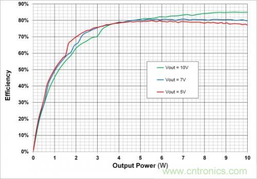 圖6.在5V,7V和10V輸出設置時,10W電源係統的端到端效率