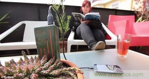 智利工程師最新研製的生物充電器——“E-Kaia”可以將植物變成一個個小小的“充電站”,隻需將它插入植物土壤之中,花盆的USB輸電端便能對手機等設備充電。