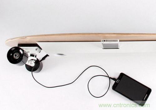 去年由荷蘭鹿特丹市的一位大學生設計的一款能對手機充電的滑板獲得了關注。滑板輪子上的發電機旋轉運行時可產生6伏電流,電流轉換成為5伏之後進入滑板的盒子裝置中,滑板運行1個小時所產生的電能可完全對一部手機充電,並且運動得越多,充電滑板存儲的電量就越多,最多可為手機進行8次充電。