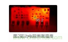 有時,電路參數和性能看似正常,但實際上隱藏很大的問題。如圖 2所示,某電路基本性能沒有問題,但在常溫下,用紅外熱成像儀一測,不得了了,MOS管的驅動電阻表麵溫度居然達到95.2℃。長期工作或高溫環境下,極易出現電阻燒壞、模(mo)塊(kuai)損(sun)壞(huai)的(de)問(wen)題(ti)。可(ke)見(jian),研(yan)發(fa)過(guo)程(cheng)中(zhong)使(shi)用(yong)熱(re)成(cheng)像(xiang)儀(yi)測(ce)試(shi)元(yuan)器(qi)件(jian)的(de)溫(wen)度(du)尤(you)其(qi)重(zhong)要(yao),可(ke)及(ji)時(shi)發(fa)現(xian)並(bing)定(ding)位(wei)問(wen)題(ti)點(dian)。通(tong)過(guo)調(tiao)整(zheng)電(dian)路(lu)參(can)數(shu),降(jiang)低(di)電(dian)阻(zu)的(de)歐(ou)姆(mu)熱(re)損(sun)耗(hao),且(qie)將(jiang)電(dian)阻(zu)封(feng)裝(zhuang)由(you)0603改成0805,大大降低了表麵溫度。