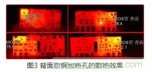 b) MOS管與背麵的銅平麵的溫差大大減小,熱孔的傳熱性能良好。