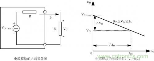 圖 1為電源模塊的內部等效與輸出負載特性曲線:VO=f(IO),R為模塊的輸出阻抗(包含導線電阻和接觸電阻等),空載時,模塊輸出電壓為最大值VO(max)。當負載電流變化△IO時,負載電壓變化量為△VO,△VO=R*△IO,R*△IO也表示模塊的負載調整率。負載電壓VO與負載電流IO的關係可表示為: