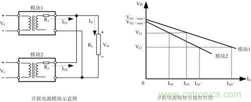 如果兩個模塊的參數完全相同時,即:VO1(max)= VO2(max)、R1=R2,則兩條負載特性曲線重合,能實現負載電流均勻分配。但在實際應用中,兩個具有相同容量的模塊,VO1(max)與VO2(max)、R1與R2的參數也不可能完全做到相同。從圖 2可以看出,由於輸出到負載RL的等效阻抗R1、R2很小,輸出電壓即便出現很小的差別也會引起輸出電流很大的變化。例如:當負載RL電流由IO= IO1+ IO2增大到IO、=IO1、+IO2、時,負載特性曲線斜率小的模塊1將承受大部分負載電流,模塊1將運行在滿載或過載限流狀態,影響模塊的可靠性。