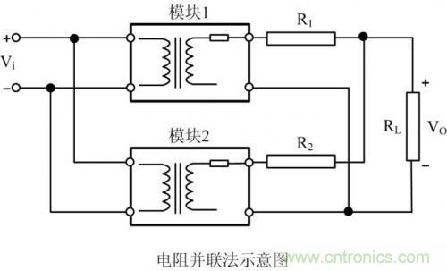 圖 3是一種采用比較多的電源並聯方案:電源輸出電阻並聯法。在兩組模塊輸出端先分別串接電阻R1、R2,然後再並聯。此種方案主要利用電阻R1、R2上shang的de線xian性xing電dian壓ya,使shi得de兩liang組zu模mo塊kuai盡jin量liang達da到dao負fu載zai均jun衡heng目mu的de,避bi免mian負fu載zai特te性xing曲qu線xian斜xie率lv小xiao的de模mo塊kuai承cheng受shou大da電dian流liu輸shu出chu。此ci並bing聯lian方fang案an成cheng本ben低di,但dan隻zhi適shi合he在zai精jing度du要yao求qiu不bu高gao、輸出功率不大的場合