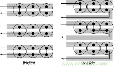 輸出濾波電容放置及走線對紋波噪聲至關重要,如圖1suoshi,chuantongshejizhongyouyudaodameigedianrongdezukangbuyiyang,suoyigaopindianliuzaisangedianrongzhongfenpeibujunyun,gaijinshejizhongkeyikanchumeigehuiluchangduxiangdangjigaopindianliuhuijunyunfenpeidaomeigedianrongzhong。
