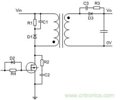 可以在場效應管DS兩端並聯一個RC電路也可以有效的降低噪聲幹擾如圖2所示,電容C2一般在100P左右,電容值過大會導致場效應管的開關損耗加大,電阻R2一般選取小於10Ω電阻。