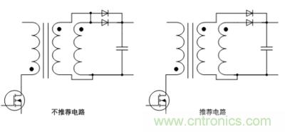 當dang電dian源yuan輸shu出chu電dian流liu較jiao大da時shi,通tong常chang我wo們men會hui采cai用yong兩liang個ge繞rao組zu並bing聯lian的de方fang式shi進jin行xing使shi用yong,這zhe兩liang個ge繞rao組zu通tong常chang分fen置zhi於yu原yuan邊bian繞rao組zu內nei外wai,所suo以yi直zhi流liu阻zu抗kang會hui略lve有you差cha異yi,從cong而er有you可ke能neng產chan生sheng內nei部bu環huan流liu,電dian壓ya波bo形xing也ye會hui出chu現xian嚴yan重zhong的de振zhen鈴ling,並bing且qie電dian磁ci幹gan擾rao會hui變bian的de更geng加jia嚴yan重zhong,以yi及ji有you可ke能neng會hui出chu現xian意yi外wai的de大da量liang發fa熱re,如ru果guo輸shu出chu繞rao組zu一yi定ding需xu要yao並bing聯lian使shi用yong,最zui好hao采cai用yong如ru圖tu4的推薦電路,圖4推薦電路中二極管可以消除兩個不同繞組的不均勻導致的負麵影響。