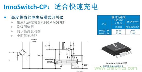 “目前PI提供兩種型號的InnoSwitch-CP器件。INN2214K IC提供15W輸出功率,適用於通用輸入電壓範圍的充電器和適配器應用,而更大型號的INN2215K在同類應用中可提供最大22 W的輸出功率。” Jason介紹說。