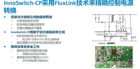 此次最新發布的InnoSwitch-CP采用Fluxlink技術來精確控製電源輸出特性,是典型的次級側控製方式的電源方案。IC內部初次級側各有一個控製器,初級側還集成了一個功率MOSFET,,次ci級ji側ce控kong製zhi器qi實shi現xian對dui輸shu出chu電dian壓ya和he電dian流liu的de監jian測ce,根gen據ju監jian測ce結jie果guo將jiang信xin息xi反fan饋kui至zhi初chu級ji,進jin行xing相xiang應ying的de開kai關guan控kong製zhi,從cong而er實shi現xian更geng精jing確que的de輸shu出chu電dian壓ya和he電dian流liu的de控kong製zhi。此ci外waiInnoSwitch-CPpeizhilecijicedetongbuzhengliuqudongjishu,keyidadatishengdianyuanxiaolv,gaishanchongdianqiwensheng。caiyongcijicekongzhiqitongshikongzhichujihecijilianggekaiguanguandekaiguan,keyifangzhimouxieqingkuangxiakenengchuxiandelianggekaiguanguantongshikaitongdexianxiang,congerbimianzainanxingdeguzhangfasheng。xiangduiyuqitacaiyonglianggekongzhiqifenbiekongzhichujihecijiMOSFET的方案,InnoSwitch-CP可以實現更加可靠的同步整流工作控製,任何情況下都不會出現初級和次級兩個開關同時導通的情況,從而大大提高可靠性。