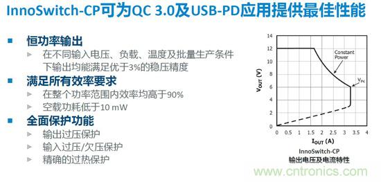 InnoSwitch-CP專門應對QC3.0開發。CP是指輸出電壓在6V-12V之間,輸出功率始終是18W,由於是次級反饋電源方案,InnoSwitch-CP可以實現正負3%的輸出穩壓精度。而一般快充方案隻能達到5%的穩壓精度,初級側反饋方案達到3%的精度尤其困難。