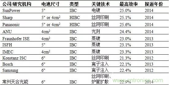 在IBC結構上,SunPower公司的研發遙遙領先,其它研究成果如德國FraunhoferISE的23%,ISFH的23.1%,IMEC的23.3%等等。最近,日本的研發人員將IBC與異質結(HJ)技術相結合,在2014年將晶體矽電池的效率突破到25%以上。其中日本Sharp和Panasonic公司將IBC與HJ技術結合在一起,研發的晶矽多結電池效率分別達到25.1%和25.6%。
